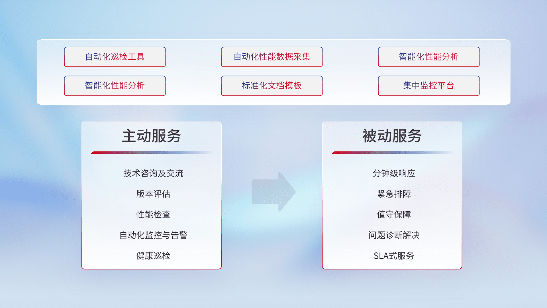 智能化工具和标准化文档,,保障服务质量,,提供主动服务(包含技术咨询、、、、版本评估、、性能检查、、、、自动化监控与告警、、、健康巡检)和被动服务包含(分钟级响应、、、、紧急排障、、值守保障、、问题诊断解决、、SLA服务)。。。。