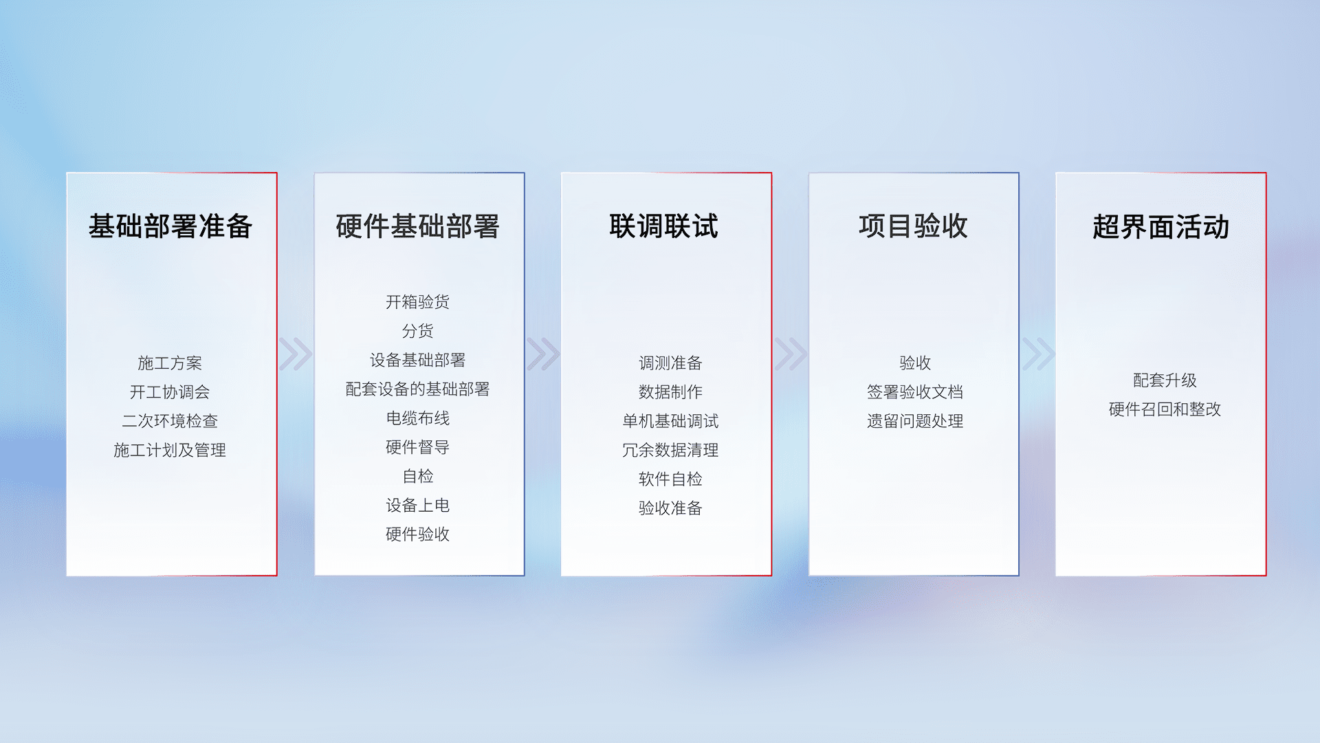 从基础部署准备、、、硬件基础部署、、、联调联试、、、、项目验收、、、越界面活动的全过程可追溯,,保证施工质量和进度。。